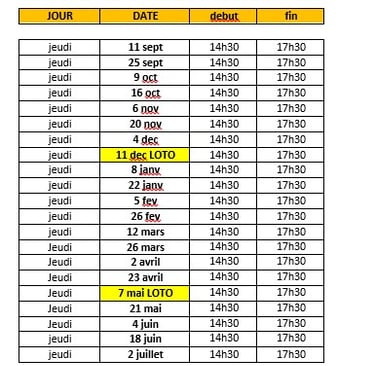 de 14h30 à 17h30 ( voir le calendrier ci-dessous)